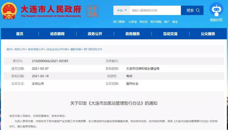 2月17日,大连市人民政府发布关于印发《大连市加氢站管理暂行办法》的通知,有效期两年。其中规定加氢站建设由大连市住房和城乡建设管理局主管。