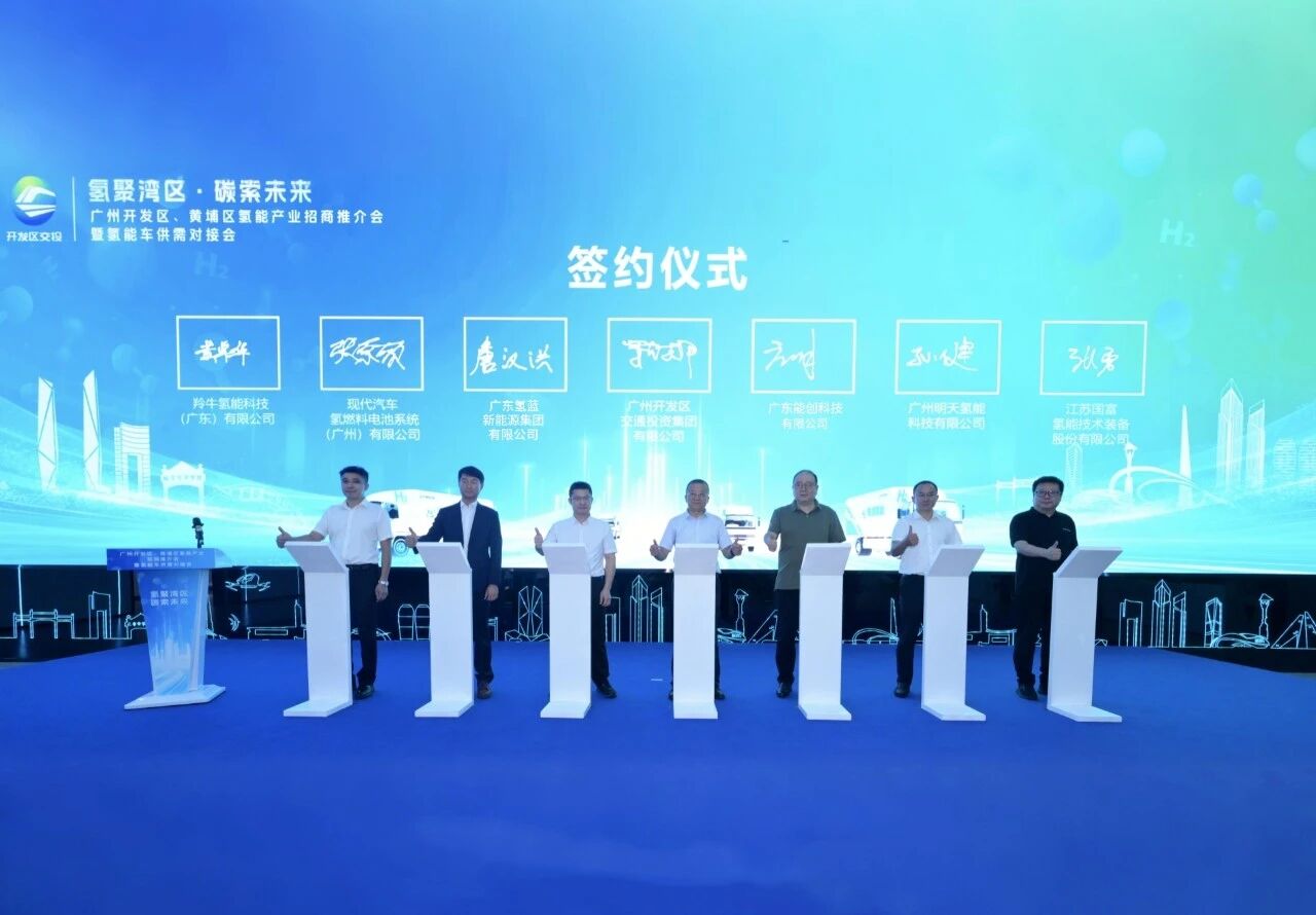 会议现场,广州开发区交投集团与HTWO广州、氢蓝时代、明天氢能、羚牛氢能、能创科技、国富氢能6家涵盖制氢、电池、整车及运营的上下游头部企业签约,聚链成势,共同勾勒氢能产业协同发展的崭新蓝图。