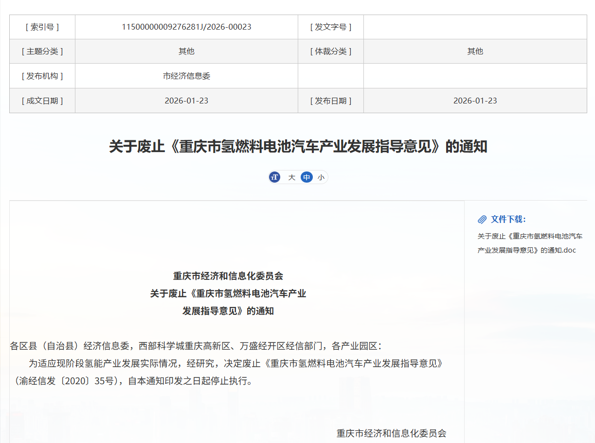 1月23日,重庆市经济和信息化委员会发布废止《重庆市氢燃料电池汽车产业发展指导意见》的通知。通知显示,为适应现阶段氢能产业发展实际情况,经研究,决定废止《重庆市氢燃料电池汽车产业发展指导意见》(渝经信发〔2020〕35号),自通知印发之日起停止执行。