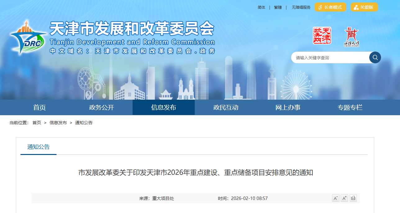 [ 导读 ]2月10日,天津市发展改革委发布天津市2026年重点建设、重点储备项目安排意见的通知。为充分发挥重大项目稳投资、促增长的支撑作用...