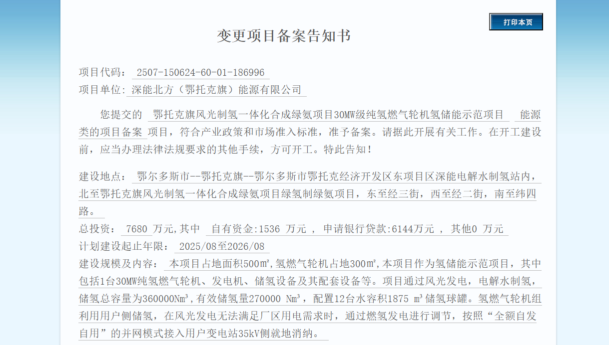 近日,鄂托克旗风光制氢一体化合成绿氨项目30MW级纯氢燃气轮机氢储能示范项目变更备案。项目建设内容新增360000Nm³储氢部分。