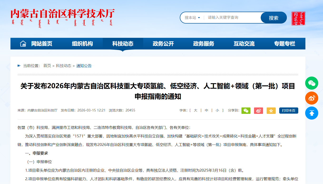 关于发布2026年内蒙古自治区科技重大专项氢能、低空经济、人工智能+领域(第一批)项目申报指南的通知