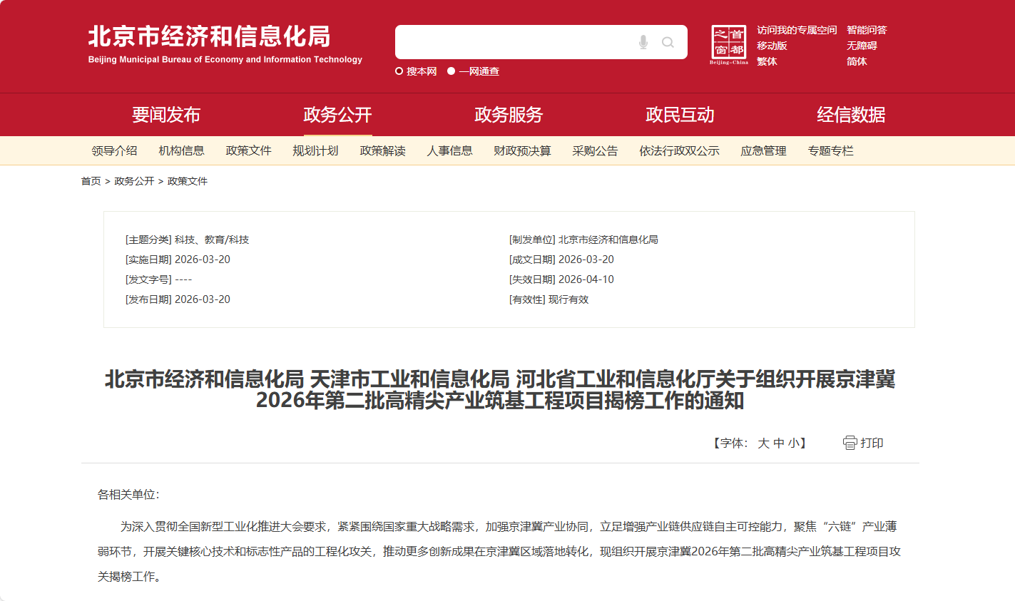 [ 导读 ]3月20日,北京市经济和信息化局、天津市工业和信息化局、河北省工业和信息化厅联合发布《关于组织开展京津冀2026年第二批高精尖产...