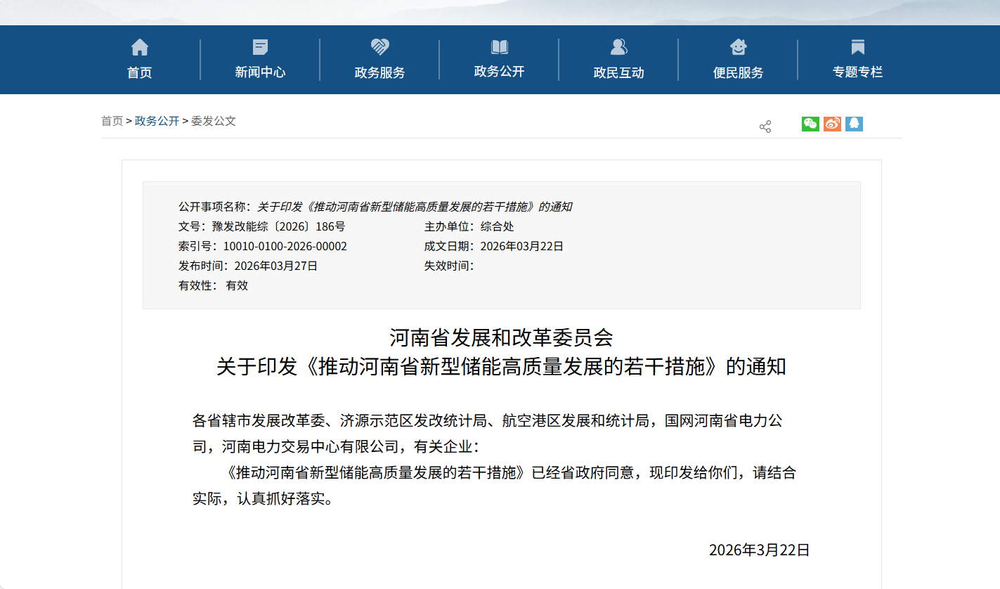 [ 导读 ]3月27日,河南省发展和改革委员会发布《推动河南省新型储能高质量发展的若干措施》,目标2030年,新型储能实现规模化发展,技术创...