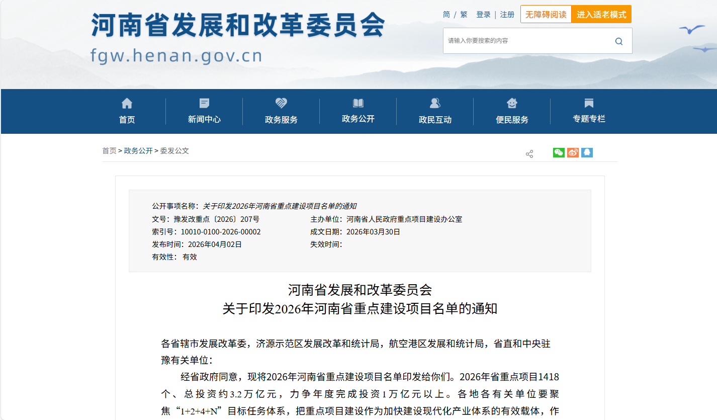 4月2日,河南省发展和改革委员会发布2026年河南省重点建设项目名单,2026年省重点项目1418个、总投资约3.2万亿元,力争年度完成投资1万亿元以上。