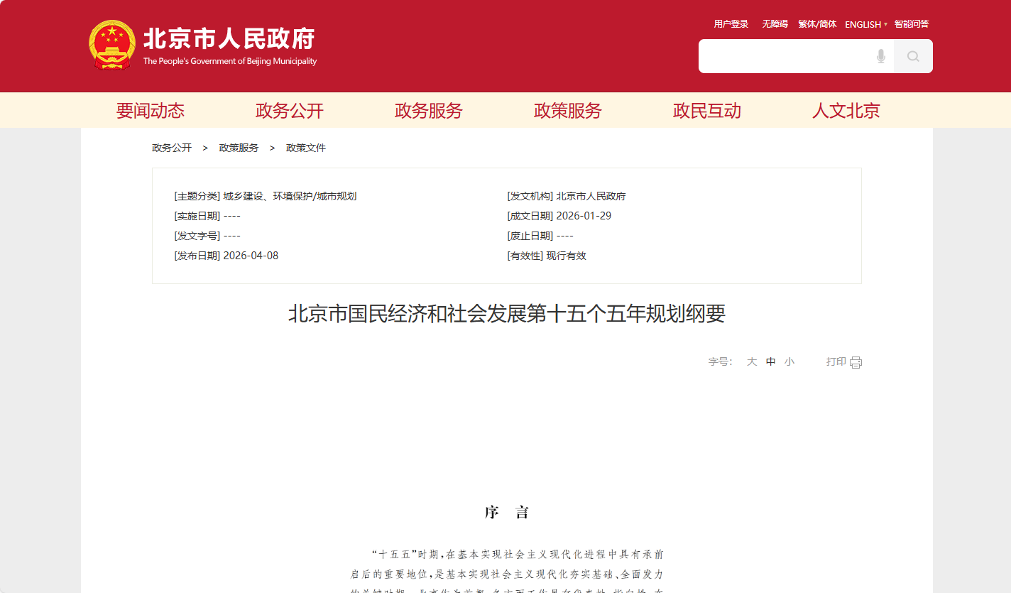 4月8日,北京市人民政府发布《北京市国民经济和社会发展第十五个五年规划纲要》(以下简称“《纲要》”),确定了“十五五”时期北京市经济社会发展的总体思路、主要目标和重点任务。