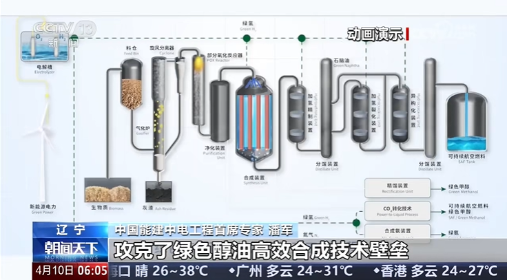 绿色醇油是一种清洁低碳的液体燃料。它的生产过程,简单来说,就是用风能、太阳能等可再生能源发电,再电解水制取氢气,然后将氢气与从农林废弃物(如秸秆、树枝等)中提取的绿色碳源进行反应,最终合成甲醇和航空燃料。