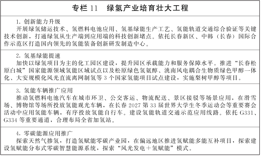 《纲要》提出创新能力升级、氢基绿能提速、氢能车辆推广应用、零碳能源应用推广4个绿氢产业培育壮大工程。其中,在氢能车辆推广应用中,《纲要》提到在滑雪场、博物馆等场所投放氢能观光车辆,在长春2027第33届世界大学生冬季运动会等重要赛会活动中应用氢能车辆,有序投放氢能自行车。