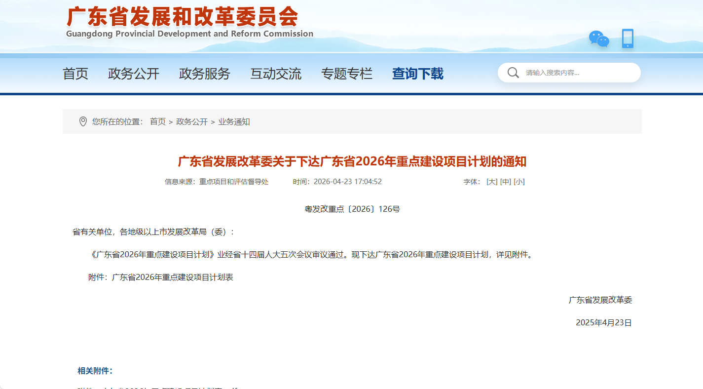 4月23日,广东省发展改革委公布《广东省2026年重点建设项目计划》。