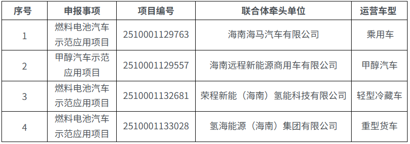 海南省第二批(2025—2026年)燃料电池汽车等技术示范应用项目公布