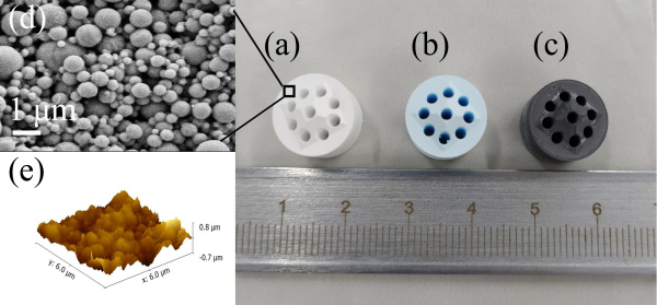 (a):DLP-3D打印后的基底载体,(b):浸渍干燥结晶后的样品,(c):煅烧后的样品,(d)(e):样品的SEM图像和原子力显微镜的表面形状。