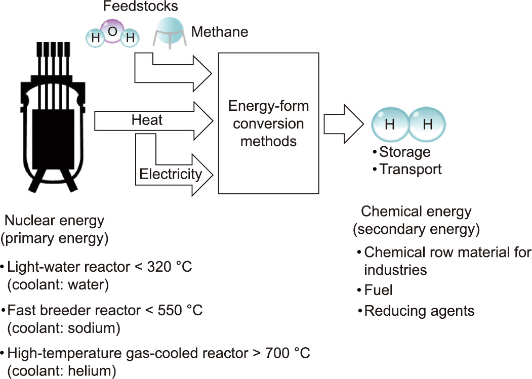 由于低温水电解法可以仅由电能驱动,因此可以使用轻水反应器、快中子增殖反应器或高温气冷反应器作为能源。高温蒸汽电解所需的水汽化热(i)也可以由轻水反应堆、快中子增殖反应堆或高温气冷反应堆提供。