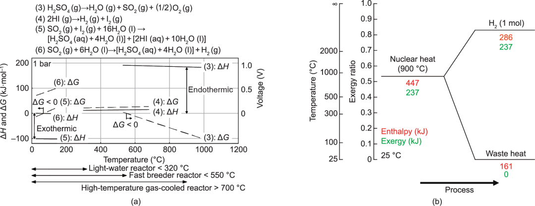 图4(b)是用热化学循环将核热能转化为氢能的能量转换图。原则上,1 mol的氢气可以从447 kJ的热量(900℃)中获得。通过耗尽近一半约0.5(900℃)㶲效比的核热能,可以将核热能转化为具有约0.8高㶲效比的氢能。