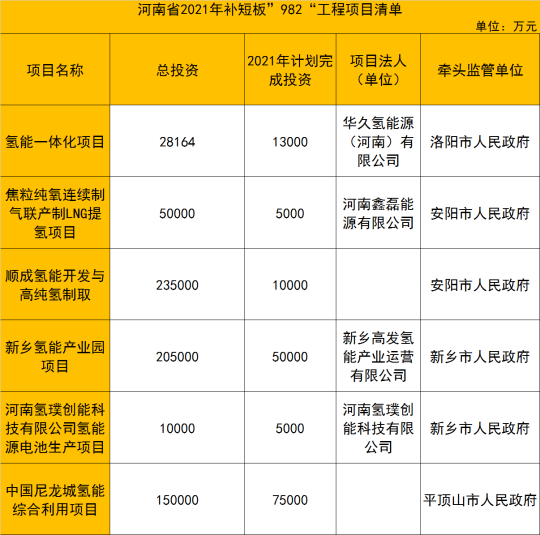 近日,河南省印发了《河南省2021年补短板“982”工程实施方案》,有6个氢能与燃料电池项目被选入方案。