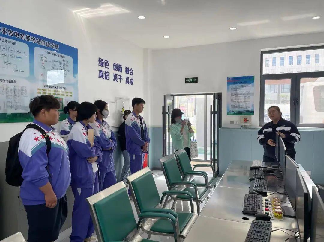 参观过程中,同学们严格遵守现场安全规程,时刻保持现场秩序。该公司结合目前氢能产业现状,详细介绍了公司在吉林省内的氢能产业布局,以及对国内、外市场氢基绿色能源的长期战略规划。随后,现场技术人员对国家电投自主研发制造的PEM制氢设备以及创新打造的前站后厂式“可再生能源+PEM制氢+加氢”一体化运作模式进行详细讲解,充分展示了公司推动氢能产业发展取得的显著成效。值得一提的是,本次参观同学们全程乘坐氢能大巴往返市区,切身实地感受氢能的“魅力”。